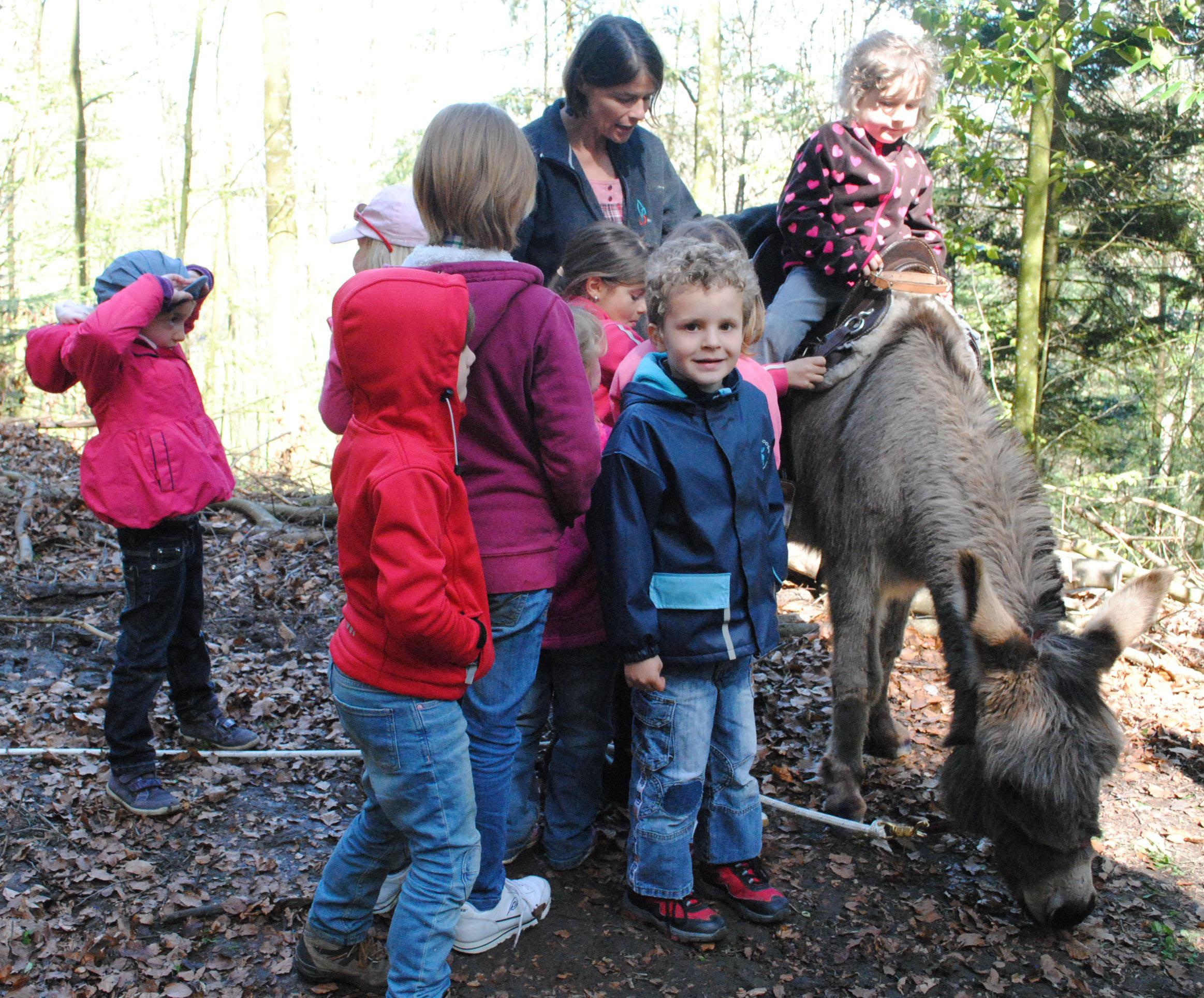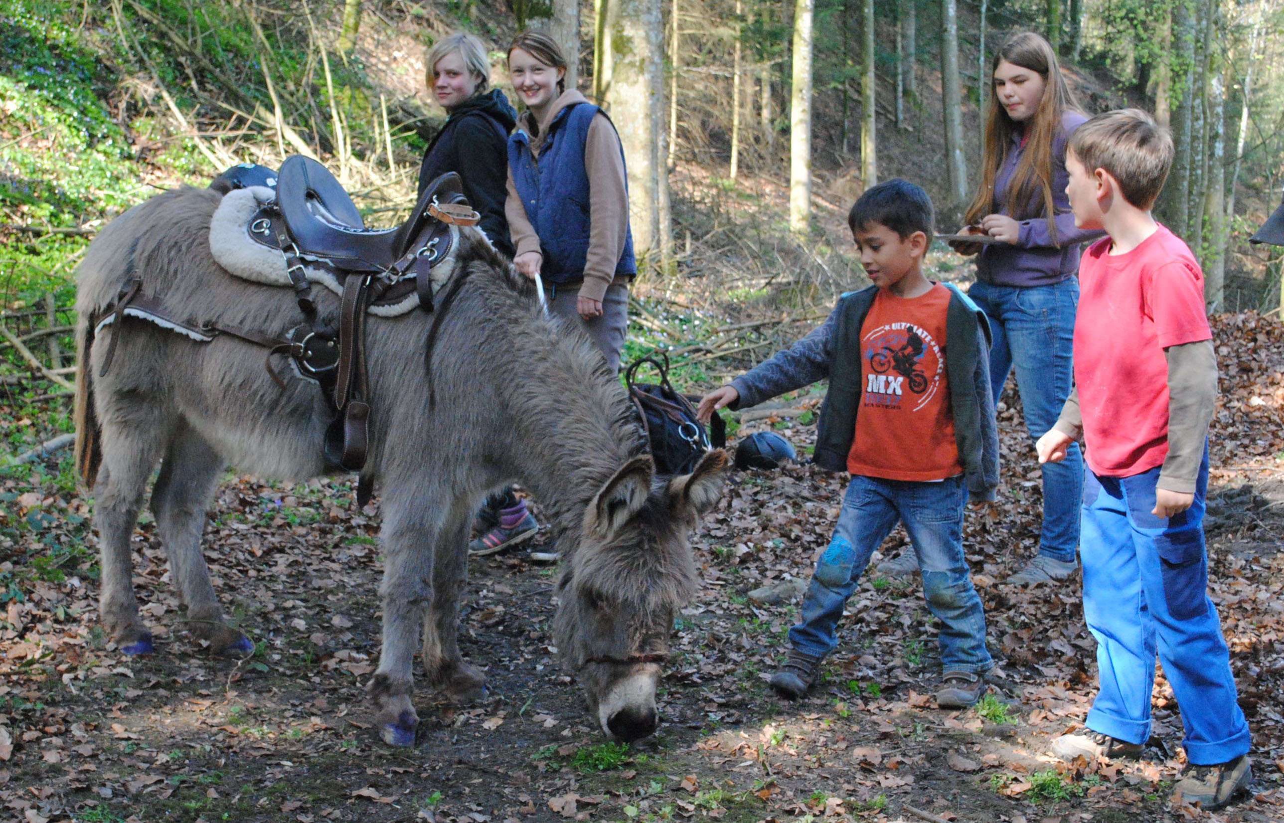 Die Geschichten um den Hirten mit seinen Schafen wurde den Kindern im Ruedertal sehr aktuell und anschaulich vermittelt. Die muntere Schar besuchte eine kleine Schafherde, begleitet vom kleinen Esel "Don Camillo". Im WB 29 vom 16. April 2014.