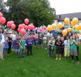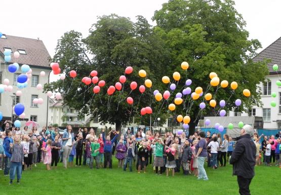 Zum Schuljahresbeginn wurden die Erstklässler von ihren älteren Schulkameraden mit einem Lied begrüsst und alle Kinder durften einen mit Gas gefüllten Ballon gegen den Himmel steigen lassen.