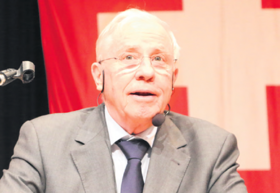 Das Phänomen Blocher: Längst hat er das Pensionsalter erreicht, doch wirbelt er nach wie vor in der Politszene herum. Sein jüngster Auftritt in Holziken zeigte, dass er die Massen nach wie vor erreicht. In der Mehrzweckhalle fanden sich gegen 600 Zuhörer ein, die sogar "Blocherli" anbeissen konnten.