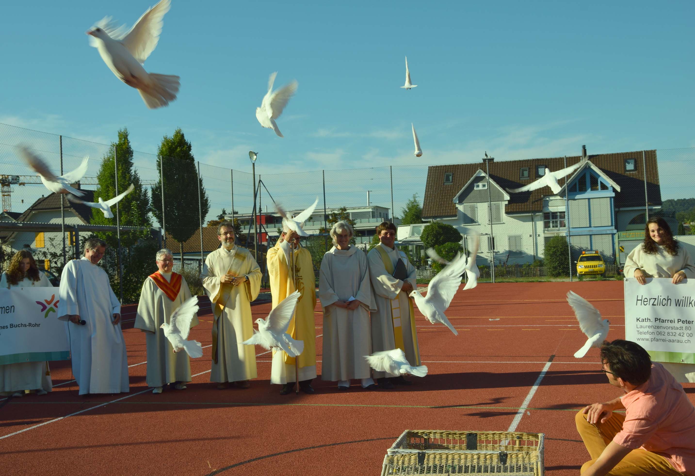Grosses Fest für die katholische Pfarrei Heilige Familie in Schöftland: Im Beisein von Bischof Felix Gmür wurde der Pastoralraum Region Aarau, welcher fünf Gemeinden umfasst, offiziell errichtet. Mit dabei war der Verein insieme, und behinderte Menschen inszenierten die Geschichte des Bartimäus.