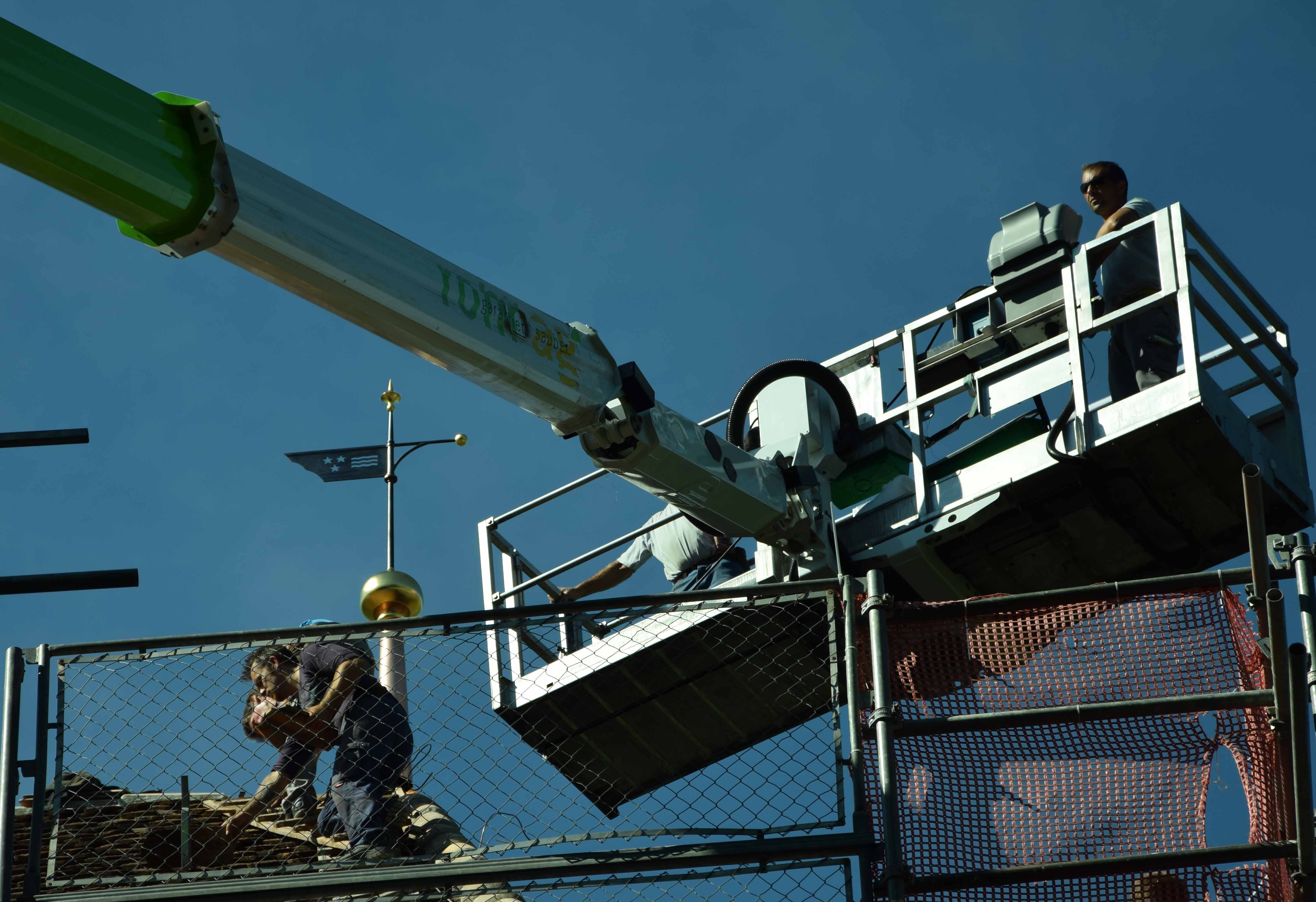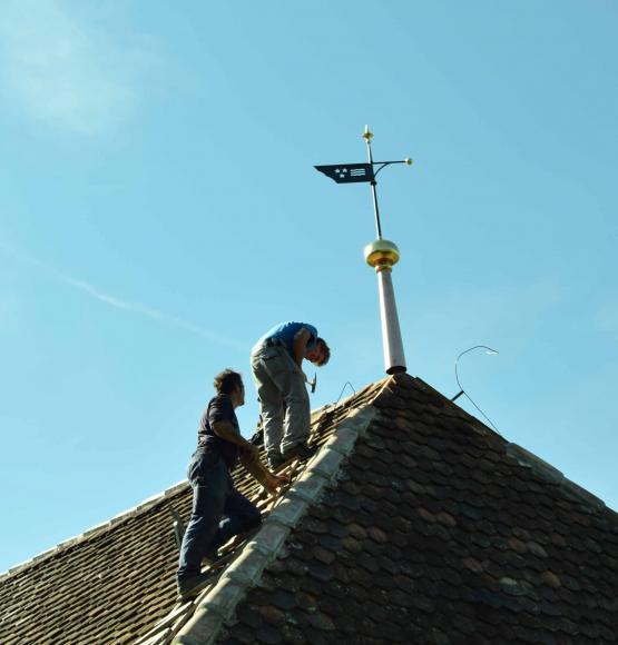 Nun wissen die Schlossrueder immer, woher der Wind weht. Auf dem First des Schlosses wurden zwei gediegen gearbeitete Wetterfahnen montiert. Diese Arbeit hatte ihre Tücken. Es entstanden atemberaubende Bilder. Rund drei Jahre soll die Renovation des Schlosses in Anspruch nehmen.