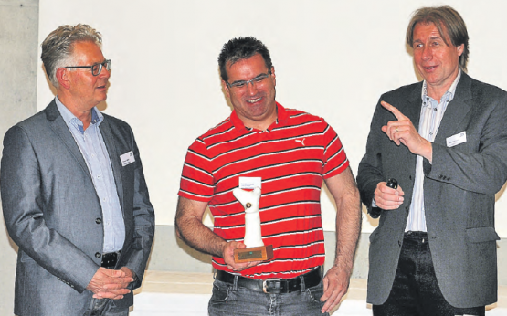 Preisverleihung anlässlich des Besuchs von aargauSüd Impuls in der Stiftung Lebenshilfe: Thomas Oettiker (links) und Martin Spielmann (rechts) überreichten Beat Niederhauser Produktionsleiter der Firma Eichenberger Gewinde den «O-G-I» für das Engagement bei der Eingliederung von Klienten in den Erwerbsalltag.