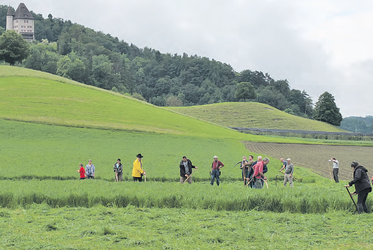 Beim Natur- und Vogelschutzverein Gränichen hatten sich 19 Teilnehmerinnen und Teilnehmer zum Sensen-Mähkurs angemeldet. Auf dem Hof von Peter Suter konnten Hansjörg von Känel und seine beiden Helfer Lydia Jurt und Matthias Biedermann willkommen geheissen werden.
