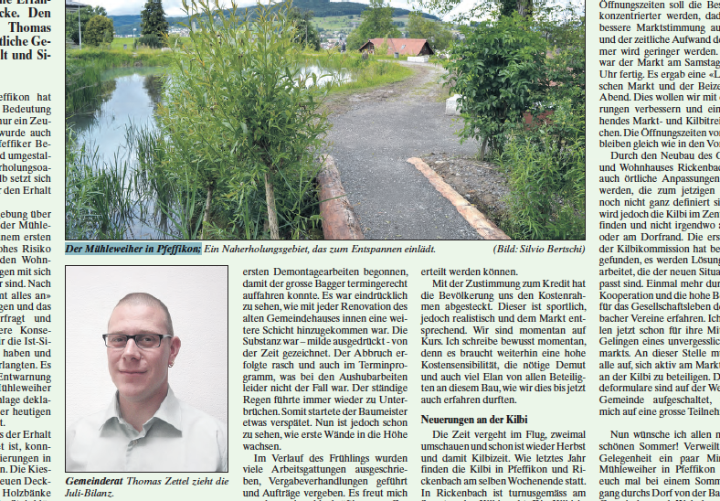 Einmal im Monat berichten die einzelnen Rickenbacher Gemeinderäte und der Gemeindeschreiber abwechslungsweise über Aktivitäten aus ihrem Tätigkeitsgebiet. Im Juli-Beitrag schreibt Gemeinderat Thomas Zettel über den Mühleweiher in Pfeffikon.