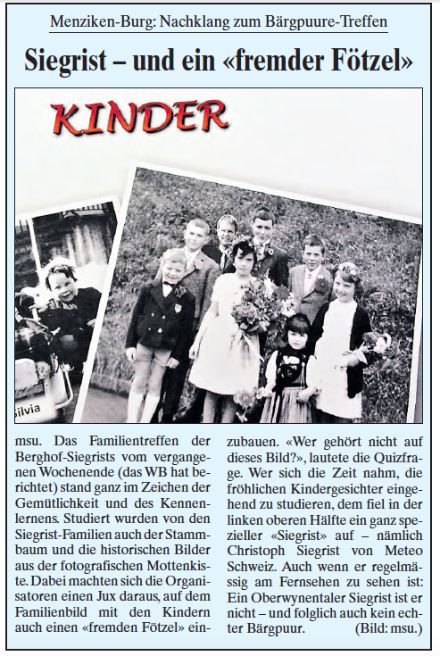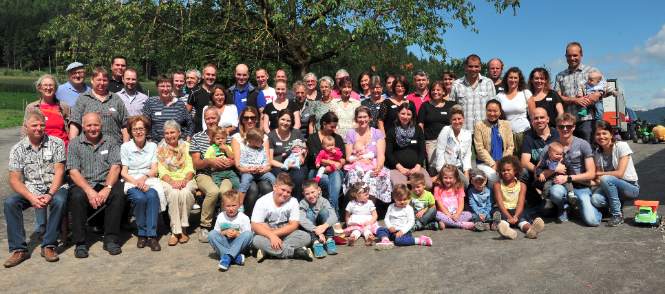 Um die 60 Familienmitglieder hatten sich in der zur Festwirtschaft umfunktionierten Scheune von Jörg und Marietta Siegrist zum grossen Stelldichein eingefunden. Petrus machte nach mehreren TagenTrübsal blasen wieder einmal mit, so dass sich an den geschmückten Tischen um die Mittagszeit ein fröhliches Wiedersehen entwickelte. Mit von der Partie auch die Allerjüngsten: 8 Kinder im Alter zwischen einigen Wochen und 3 Jahren, weitere acht imAlter zwischen 3 und 8 Jahren. Mit Sonja Siegrist, der Gattin des verstorbenen Menziker Lokalhistorikers und Dorfchronisten Peter Siegrist (PS.), war auch die «Grand- Old-Lady» der Bergbauern dabei. Ihr Mann PS, seines Zeichens PR- undWerbeberater, gehörte bekanntlich über Jahrzehnte hinweg zu den treuen Mitarbeitern und Berichterstattern des Wynentaler Blattes.