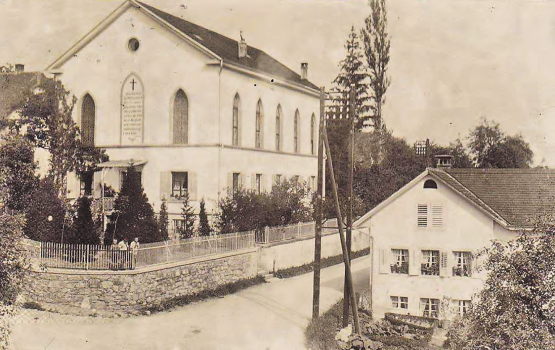 msu. Ein ganz besonderes Zeitdokument stellt uns Fritz Springer aus Seengen zur Verfügung. Es zeigt die Kapelle der Chrischona-Gemeinde im Reinacher Alzbach vor rund 100 Jahren. Damals war die Ortsverbindungsstrasse Richtung Gontenschwil noch nicht asphaltiert, und am Strassenrand standen die Holzmasten für die elektrischen Freileitungen. Das Gotteshaus in der Kurve wurde um 1877/78 erbaut. Rechts im Bild das spätere Wohnhaus der Familie Häfliger mit vielen Blumen in den Fenstern und einem gepflegten Vorgärtchen. Dieses Gebäude mit Baujahr 1849 musste der «modernen Zeit» bereits vor vielen Jahren (1979) weichen. Die Stützmauer des Kapellen-Areals zur Strasse hin bestand ursprünglich aus Natursteinen und war noch nicht verputzt… und die am Gartenzaun stehenden Menschen hatten noch Musse,…