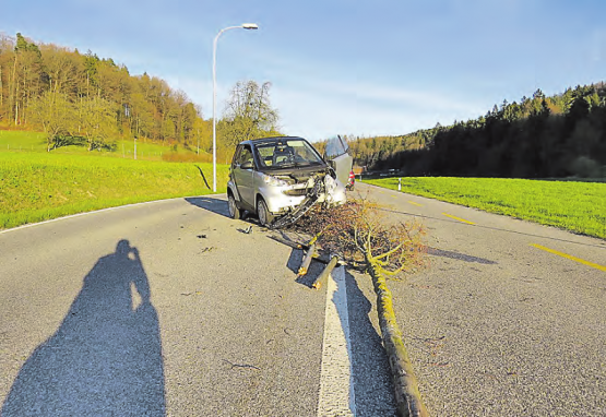 pz. Am Donnerstagabend, 12. April, fuhr eine Autofahrerin über eine Verkehrsinsel und richtete einen beträchtlichen Sachschaden an. Der Selbstunfall ereignete sich um 19 Uhr. Eine 46-Jährige fuhr mit einem Smart auf der Dürrenäscherstrasse in Richtung Teufenthal. Dorfeingangs fuhr sie frontal über eine Verkehrsinsel und prallte dabei in zwei Jungbäume und zwei Inselschutzpfosten. Die Lenkerin klagte über Nackenschmerzen. Sie wurde mit der Ambulanz ins Spital gebracht. Der Sachschaden wird insgesamt auf zirka 20’000 Franken geschätzt. Die Unfallursache wird nun abgeklärt.Allenfalls wurde die Fahrerin durch die tiefstehende Sonne geblendet. (Bild: pz.)