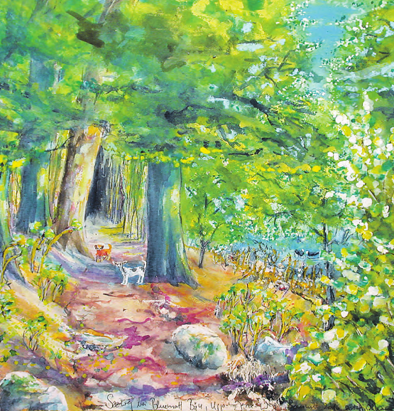 ro. Der Seeweg bei Bluematt Hallwilersee z’Böju im Vorsommer 2016. Das Wegstück erhielt von mir den Namen unserer Hundeli: Uggo-Jessi-Weg. Das Licht, die Farben, die Sträucher, die Bäume, die beiden Blässhühner im Uferbereich und die beiden Hundeli, das ist alles Natur pur und wunderschön. Schon über 40 Jahre durfte ich zusammen mit unseren Hunden diesen Seeweg erleben. Eigene Sorge und Eigenverantwortung sollen nun durch ein neuerfundenes Hunde-Laufverbot optimiert werden. So wurde das gemalte Bild für die Hundeli und uns ein Abschiedsbild. Gleichzeitig erinnert mich das Bild daran, dass eine wunderbare und lebendige Natur durch Sorgfalt über alle Jahre erhalten wurde und ich will hoffen, dass das neue Verbot mit Polizeiobhut und Bussen diesem Erbe weiterhin auch Sorge tragen kann.