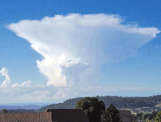 (Eing.) Vorgestern Abend sah man im Norden einen riesigen Wolken-Pilz am Himmel. Diese Wolken sind typisch für den Sommer. Sie entstehen über dem erhitzten Land und wachsen in die Höhe. Dabei können Sie ohne weiteres eine Höhe von 12 Kilometern erreichen. Bei dieser Grösse sind sie jeweils in einem grossen Umkreis sichtbar. So befand sich dieses Exemplar über dem Feldberg im Schwarzwald. Meistens haben diese Wolken Schauer, Blitz und Donner und sogar Hagel im Gepäck. Der Meteorologe bezeichnet solche Gewitterwolken als Cumulonimbus. Der Name ist lateinisch und zusammengesetzt. So heisst Cumulus Haufen und Nimbus Regen oder Sturm. (Text und Bild: Andreas Walker)