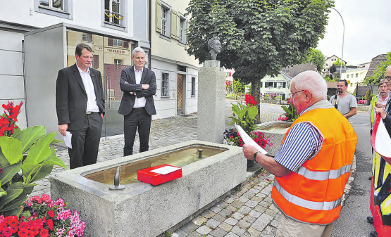 msu. Friedlicher Bürgerprotest vor dem Gemeindehaus in Beromünster: «Usechoo… usechoo!» forderten die Petitionäre den Gemeinderat lautstark auf. Mit 540 Unterschriften machen sich Möischtererinnen und Möischterer für die sofortige Realisierung der Entlastungsstrasse West stark. Das von einem Trommler angeführte Komitee wurde Augenblicke später von Gemeindepräsident Charly Freitag und von Gemeindeschreiber Daniel Bucher, den beiden elegant gekleideten Herren hinter dem Brunnen, freundlich empfangen. Wie die Behörde auf die Petition reagierte und wie es mit der Umfahrung weiter geht, ist in der nebenstehenden Rubrik «Stimmen und Standpunkte»zu lesen. (Bild: msu.)
