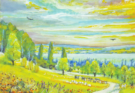 ro. Lochhalden Böju, hinunter zum Hallwilersee Ein Sommertag erwacht. Die Baumann-Schafe und Kühe sind noch abwartend, und meine Hundeli schauen zu. Wie befriedigend muss es für die Baumann-Leute sein, dieses wunderschöne Land bewirtschaften und pflegen zu dürfen. Persönlich nur bedingt zugeneigt dem Zeitgeist und der Zukunft, so finde ich die Ruhe, die Harmonie im Bild eingefangen eben schon ganz besonders. Ich weiss dies sehr zu schätzen, eine Landschaft erleben zu dürfen in ihrer eigenen Sprache – ohne Hochhäuser, ohne Fabrikanlagen, ohne Kühltürme, Autobahn-Brücken und ohne Hochgeschwindigkeits-Schnellbahnen, und sogar mit noch unüberbauten natürlichen Uferbereichen. Ich komme mir fast vor wie einer der beiden Vögel, geniessend und schwebend eingebunden.