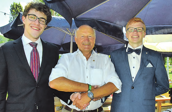 st.Anlässlich der Jubiläums- und Jugendfest-Morgenfeier in Hirschthal platzten sie plötzlich herein,Tobias Goldenberger (li.) und Andrin Kohler (re.). Ihre Laune war blendend, denn soeben ging für sie die Maturitätsfeier zu Ende und die beiden jungen Männer stehen am Anfang ihrer beruflichen Karriere. Der Hirschthaler Gemeindeammann Peter Stadler liess es sich nicht nehmen, ihnen in aller Öffentlichkeit herzlich zu gratulieren und für ein Bild zu posieren. (Bild: st.)