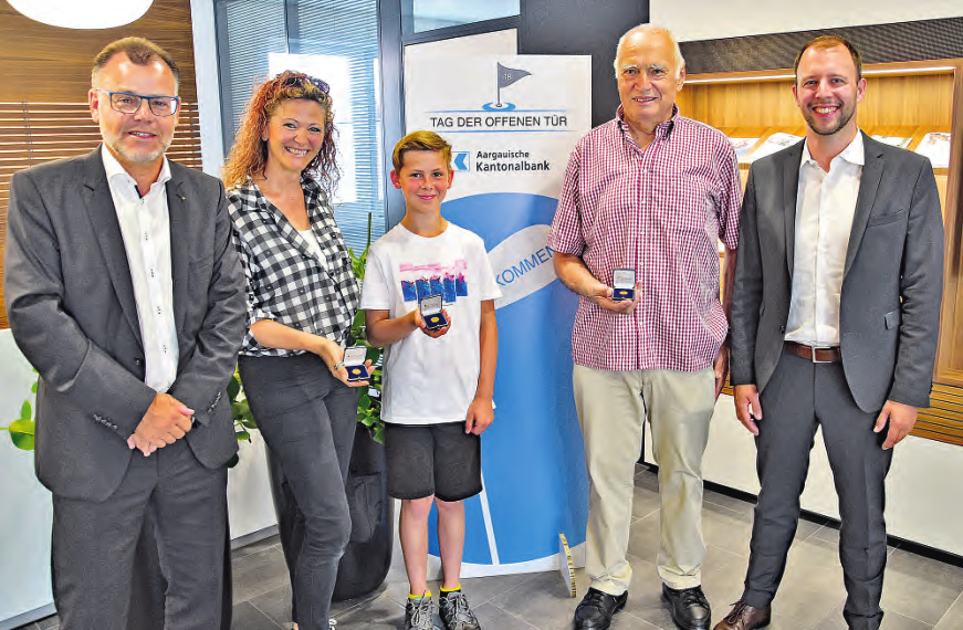 aw. Jürg Rüfenacht, Leiter Dienste der Aargauischen Kantonalbank, übergab den drei Besten des 9-Loch-Minigolfturniers, das im renovierten Geschäftsgebäude am Lindenplatz 18 anlässlich des Tags der offenen Tür stattfand, das ersehnte Goldvreneli. Auf dem anspruchsvollen Parcours, der über alle Stockwerke des AKB-Gebäudes führte, benötigte der Zofinger Hannes Wirz als bester Minigolfer 20 Schläge. Mit einer ansprechenden Leistung von 22 Schlägen sicherte sich Jacqueline Badrutt aus Muhen, als beste Frau, ein weiteres «Golfvreneli». Ein glücklicher Gewinner ist auch der junge Tino Häfliger. Eine grosse Anzahl an Besucherinnen und Besuchern absolvierten mit 26 Schlägen den Minigolf-Parcours. Das Los fiel auf den Reidner Schüler. Die drei Gewinner in der Bildmitte, umrahmt von…