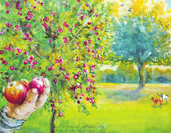 (Text und Aquarell und Mischtechnik 50x60cm 2018. Erntedank dem Apfelbaum Arlet im Gumen z’Böju, von Alberto…