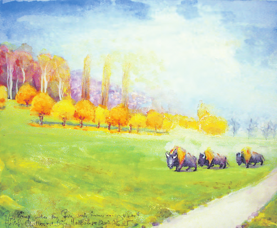 ro. Auf dem Spaziergang, entlang des Hallwilersees gegen die Teufi z’Böju hin, leuchtet der Herbst unglaublich schön in der Landschaft. Durch dieses farbenfrohe Leuchten entstand für mich eine Vision – plötzlich trotten da 3 Bisons neben der Strasse quer über die Wiesen und stur immer geradeaus. In der mir sonst bekannten Landschaft entstand für mich ein virtuelles Bild von 3 Königen. Ihr völlig abgehobenes vor sich Dahintrotten sagt mir, dass es die 3 berühmten Könige sein könnten, die sich da ins Seetal vertrampelt haben, auf der Suche nach ihrem leitenden Stern. Obschon es seit Weihnachten schon 10 Monate her ist. Es ist ja nicht gerade typisch und schon eher besonders, 3 Bisons im Seetal. Aber Visionen haben keine Zeit und keinen Raum. Vielleicht kommen die Bisons aus dem Nichts und…