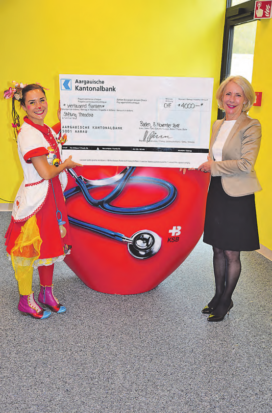 Die Aargauische Kantonalbank (AKB) unterstützt traditionell mit der Produktion ihrer Weihnachtskarten eine Aargauer Institution. Dieses Jahr ist es die Stiftung Theodora, die einen Scheck über 4000 Franken in Empfang nehmen durfte. «Wir sind sehr dankbar für diese Spende. Damit unterstützt die AKB unsere Traumdoktoren und schenkt Kinderlachen. Fröhlichkeit und Lachen sind wertvolle Therapiebegleiter», sagt Hella Immler alias Traumdoktorin Dr. Pirouette (links) und freut sich über den Scheck der AKB, überreicht durch Ursula Diebold, Leiterin Kommunikation und Marketing. (Bild: zVg.)