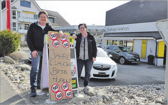 rc.Während der Fussball-WM letztes Jahr, oder wegen dem Sieg irgendeiner Schweizer Delegation kommt es in Zetzwil selten bis gar nie zu Hupkonzerten. Anders sieht es aus, wenn Claudia Müller-Graf, Inhaberin der Garage Graf AG einen runden Geburtstag feiert. Zu ihrem Fünfzigsten, den Sie am Montag begehen durfte, stellte Geschäftsführer Martin Perreten nämlich ein Schild an die Strasse, auf dem er vorbei fahrende Autos aufforderte, zu Ehren von Claudia einmal kurz zu hupen. Der Zetzwiler Durchgangsverkehr hält sich seither an die Vorgabe und seit einigen Tagen findet rund um die Garage Graf ein veritables Hupkonzert statt. «Jetzt nehmen wir es dann weg», lacht die Jubilarin, die sich über die Geste sehr gefreut hat, wie sie bei einem Augenschein vor Ort erzählt. Martin Perreten auf der…