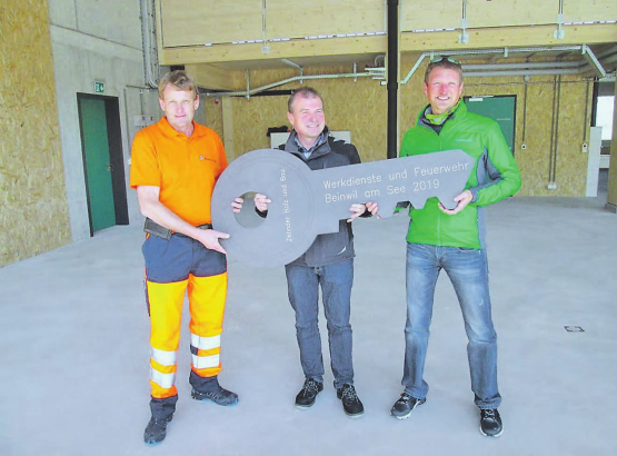 (Mitg.) Für den Neubau eines Bauamts-/Feuerwehrgebäudes hatte die Beinwiler Gemeindeversammlung am 23. Juni einen Kredit von knapp 6 Millionen Franken bewilligt. Mit dem Bau des neuenWerkhofs beauftragte der Gemeinderat nach Durchführung eines Wettbewerbs die Zehnder Holz und Bau AG aus Winterthur. Der Spatenstich für den Neubau fand am 14. Mai 2018 statt und die Bauarbeiten konnten anschliessend termingemäss ausgeführt werden.Am Frei- tag, 29. März, erfolgte nun die Übergabe des Werkhofneubaus an die Gemeinde. Noch gilt es, einzelne kleinere Pendenzen zu erledigen. Dem Bezug des neuen Gebäudes durch die Abteilung Werkdienste und die Feuerwehr steht aber nichts mehr im Weg. Am Samstag, 22. Juni, findet ein Tag der offenen Tür statt. Bild: Markus Zehnder überreicht Thomas Mosimann, Leiter…