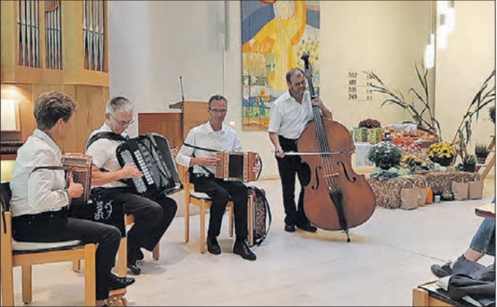 (Eing.) Am Sonntag, den 22. September wurde in der Kirche Teufenthal, wie jedes Jahr, ein Erntedankgottesdienst gefeiert. Edith Hunziker und die Landfrauen haben die Kirche mit all den Früchten und Gaben aus der Natur geschmückt. Die Schwyzerörgeli Formation «Echo Hochrüti», mit Daniel und Susanne Müller, zusammen mit Thomas Lüscher und Ernst Bärtschi, hat den Gottesdienst mit Musik bereichert. – Gedanken zum Erntedank von Pfarrerin Esther Worbs: «Nehmen wir es für selbstverständlich, dass wir diese Fülle an Gaben auf dem Tisch finden? Nehmen wir es für selbstverständlich, dass wir zusammen feiern dürfen? Dankbarkeit sieht alles als ein Geschenk an. Dankbarkeit für das zu empfinden, was das Leben uns gibt, ermöglicht uns erst etwas von Gottes Liebe, die uns trägt und erhält, zu spüren.…