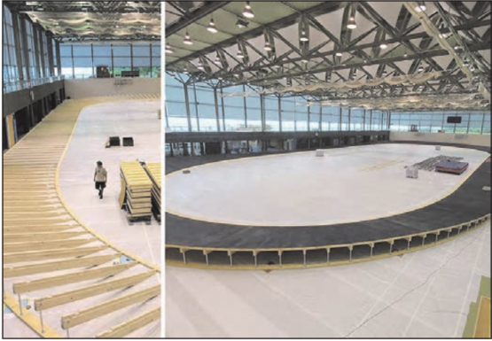 Die Sporthalle „End der Welt“ weist eine Grundfläche von 84 x 44 m auf. Die in die Jahre gekommene Halle wird nun saniert. Zu den Massnahmen gehört unter anderem der Ersatz der mobilen, 187 m langen Laufrundbahn. Das Bundesamt für Bauten und Logistik hat dafür die Verantwortung der Erni Gruppe aus Schongau übertragen. Die Unterkonstruktion der Rundbahn ist aus Holz. Die temporäre Konstruktion wird jeweils Anfang Wintersaison in der Halle aufgebaut und nach ein paar Monaten wird das Gebilde aus unzähligen, nummerierten Teilen wieder abgebaut. So ist die Halle für andere Sportarten verfügbar.