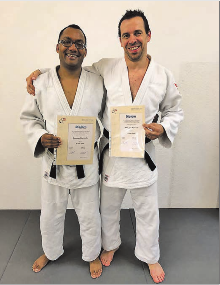 (Eing.) Nach mehreren Monaten harter Vorbereitungszeit und viel vergossenem Schweiss reisten Deepak Santschi und der Philippe Kölliker mit den Judogis im Gepäck vergangene Woche nach Bern. Dort führten sie ihr vorbereitetes Programm, bestehend aus zwei Katas und etlichen Stand- und Bodentechniken, der Dan-Prüfungskommission vor. Auch das theoretische Wissen über Judo wurde geprüft.Trotz angespannter Stimmung und grosser Nervosität konnten die beiden Prüflinge die Dan-Experten, zusammengesetzt aus etlichen hochgradierten Schweizer Spitzenjudokas, mit ihrer Leistung überzeugen. Die Experten waren sich einig und überreichten den beiden das Diplom zum 4. Dan Judo. Verdient liessen sich die beiden am Abend in kleiner Runde feiern. (Bild: zVg.)