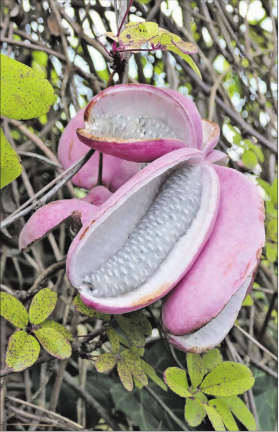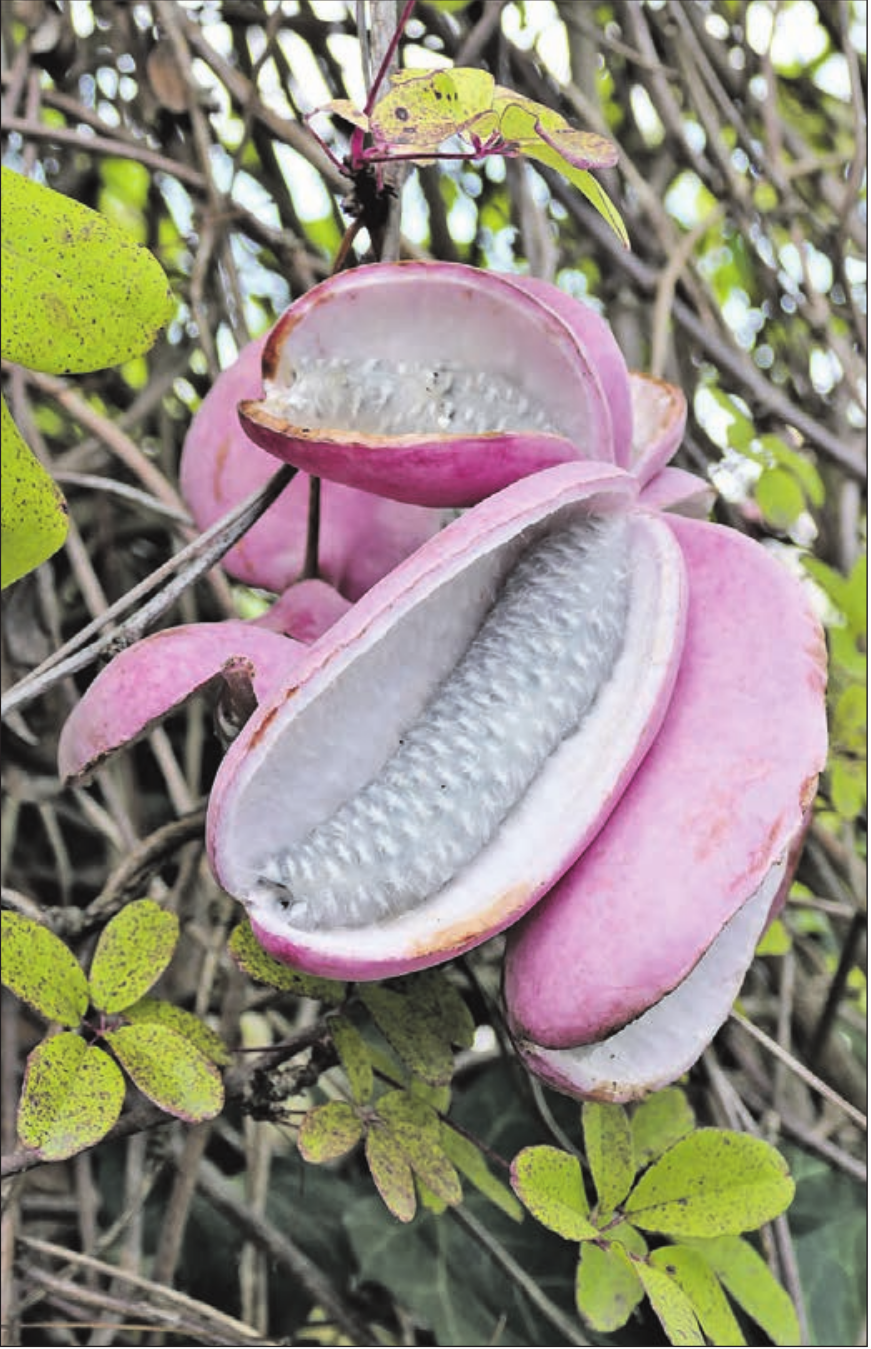 (Eing.) Die Klettergurke ist bei «uns» eigentlich eher selten anzutreffen. Dieser Pflanze an der Reinacher Gigerstrasse scheint ihr Standort aber zu behagen. Die Stange der Strassenbeleuchtung dient der Schlingpflanze dabei als Kletterhilfe. Die weinrote Blüte im Frühling und die dekorative, hellviolette Frucht präsentiert und öffnet sich im Herbst in ihrer ganzen Schönheit.