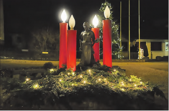rc. Der Verkehrs- und Verschönerungsverein Dürrenäsch (VVD) hat beim Dorfbrunnen den wohl grössten Adventskranz im ganzen Dorf installiert. Am 2. Advent leuchtete im Dorfzentrum denn auch schon die zweite Kerze. Wenn es schon früh dunkel wird und das garstige Wetter eigentlich nicht dazu einlädt, sich draussen aufzuhalten, «erfreut sich dieser grosser Beliebtheit», erklärt Werner Walther vom VVD. Er und die Mitglieder des Vereins freuen sich deshalb, wenn der Adventskranz in den nächsten Wochen etwas Wärme in die Herzen bringt. (Bild: Remo Conoci)