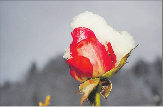 In der Nähe vom Schloss Liebegg entstand dieses Bild. Es erzeugt Assoziationen zur heutigen Zeit. Es zeigt die Realität. In winterlicher Umgebung strahlt die Blüte und bietet der frostigen Last Paroli.