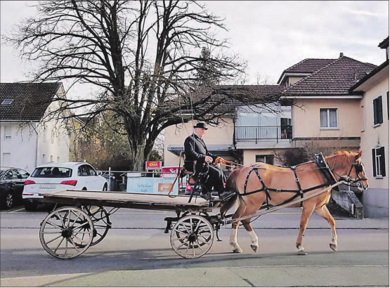… und einige Passanten dürften sich möglicherweise die Augen gerieben haben: Am heiterhellen Sonntagnachmittag ratterte dieser alte Wagen mit den eisenbeschlagenen Holzrädern und einem gepflegten Herrn im schwarzen Anzug mit Melone durch die Strassen von Reinach. Nostalgie pur – angeführt von einem im gemächlichen Gleichschritt friedlich trottenden Pferd. Auch der Vierbeiner überaus herausgeputzt und folglich ein Hingucker. Wohl dem, dessen Herz für soviel Romantik offen ist und der sich auch im 21. Jahrhundert noch wagt, den Sonntagsausflug mit einer einzigen Pferdestärke zu geniessen. Da haben die Lasermessgeräte der Polizei weder im Inner- noch im Ausserortsbereich eine Chance … (Bild: Diana Suter)