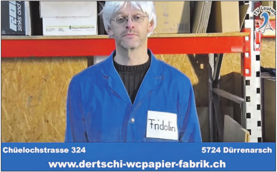 rc. Vielen sind die Kult-Werbefilme der Fischer Bettwaren ein Begriff und die zahlreichen Verballhornungen ebenso. Dass lustige Werbung auch mit WC-Rollen funktioniert, beweisen die Turner des TV Leutwil. Diese haben in Dürrenäsch eigens eine WC-Papier-Produktion eingerichtet und den Werbespot in ihrem Sinne nachgestellt. «Hier werden die einzelnen Lagen noch von Hand einzeln zugeschnitten und auf Wunsch mit dem Lieblingsmuster versehen», heisst es etwa. Im Video, das auf Youtube zu finden ist, führt Inhaber Fridolin gekonnt und kompetent durch das Firmengebäude. Auf telefonische Anmeldung kann man sogar dabei sein, wenn gebrauchtes WC-Papier gereinigt und aufbereitet wird. Aber bitte wirklich nur auf telefonische Voranmeldung! Übrigens: die Internetadresse …