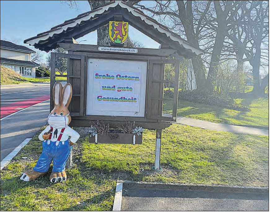 rc. Die Osterfreuden lässt man sich hier nicht nehmen. Der Verkehrs- und Verschönerungsverein Dürrenäsch (VVD) hat alle vom Bundesrat angeordneten Vorsichtsmassnahmen für Osterhasen über 1 Meter Grösse umgesetzt. Gerüchten zufolge soll dem Hasen sicherheitshalber jemand einen Fiebermesser und eine Schachtel Pretuval in der Hosentasche gesteckt haben. Dieser fröhliche Geselle präsentiert sich nun jedenfalls gut ausgerüstet am Dorfeingang und wünscht den Heimkehrern mit einem fröhlichen Lachen hinter dem Mundschutz nicht nur frohe Ostern, sondern auch gute Gesundheit. Auch nach den Osterferien hat der VVD noch einiges vor: Am 25. April findet der Pflegetag der Bänkli und Feuerstellen statt, wobei man auf das traditionelle anschliessende Bräteln wird verzichten müssen. Für den 1. August,…