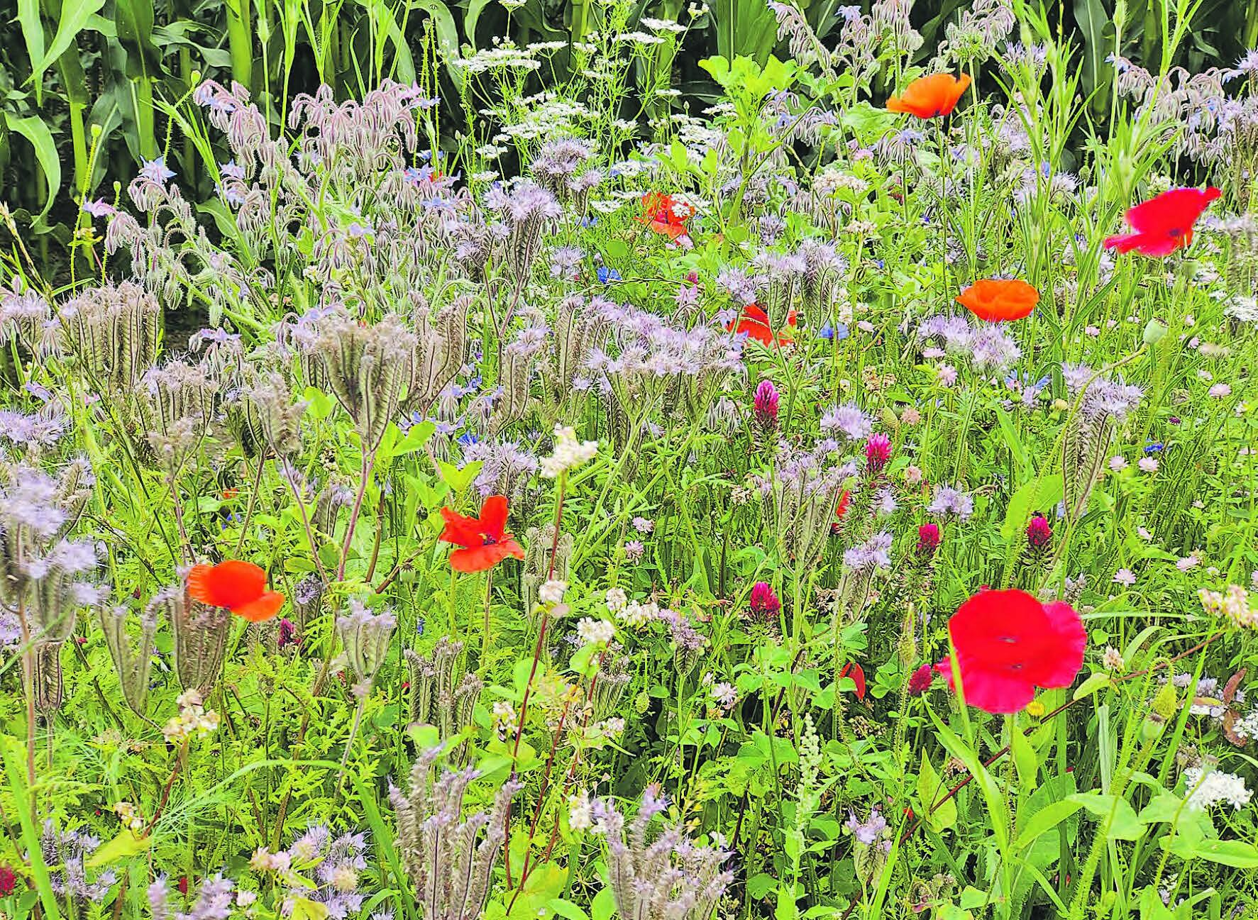 (Eing.) Ein Blumenband um einen Maisacker mit Mohn, Kornblumen, Borretsch, rotblühendem Klee, Büschelschön und vielen anderen Sorten. Ein Spielfeld für alle Insekten, die sich in fast unbegrenzter Zahl hier tummeln. Eine Pracht in krassem Gegensatz zu den um den Homberg herum aufgestellten Stelen, die wohl von der Agrochemie gesponsert sind. Diese erhalten Informationen über effiziente Landwirtschaft, Monokulturen werden gelobt und Blumen als «Platzräuber» diffamiert. Ein Rundgang auf dem Homberg lohnt sich auf jeden Fall.