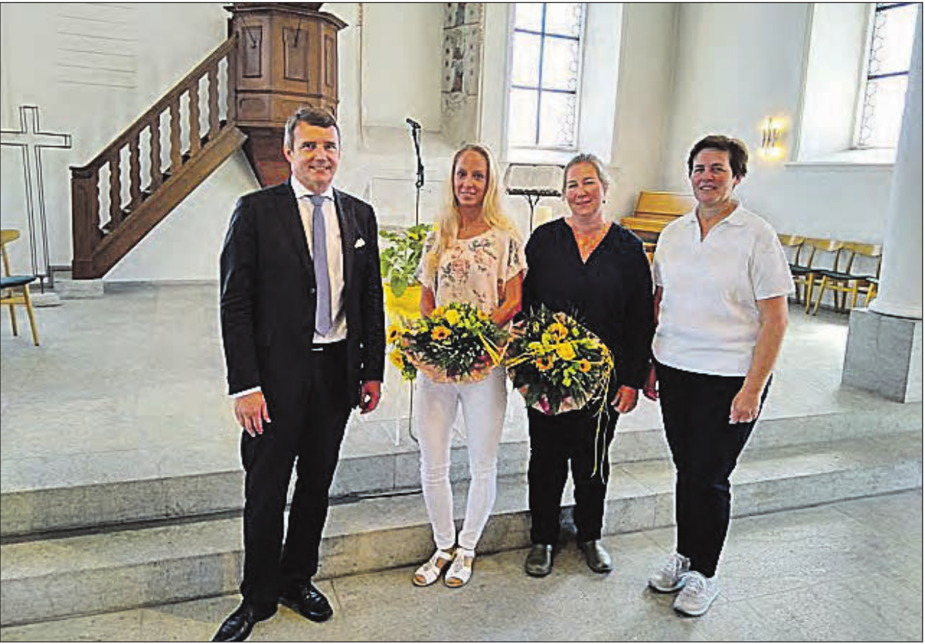 (Eing.) Am vergangenen Sonntag fand sich eine beachtliche Schar Kirchengänger zum Gottesdienst mit anschliessender ausserordentlicher Kirchgemeindeversammlung in der kühlen Kirche in Seon ein. Nach dem Gottesdienst begrüsste Kirchenpflegepräsidentin Eva Savoy (im Bild ganz rechts) die Anwesenden zur Wahl von zwei neuen Kirchenpflegemitgliedern für den Rest der Amtsperiode. Mit einem glänzenden Ergebnis wurden Sandra Geissbühler (2. v.l.) und Nicole Trachsel gewählt. Sie werden ihre Arbeit nach den Sommerferien aufnehmen. Ebenfalls auf dem Bild: Pfarrer Jürgen Will. Gleichzeitig wurde die Kirchenpflegerin Vanessa Gloor verabschiedet. Als Jüngste jemals gewählte Kirchenpflegerin hatte sie vier Jahre das Ressort Jugend unter sich. Ihr Berufsweg führt sie nun in den Nachbarkanton. 18 Jahre…