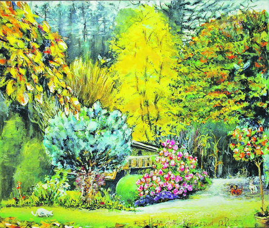 ro. Angeregt wurde das Gartenbild durch den Judasblattbaum, der im Früherbst leuchtend zitronengelb als erster Baum im Garten mit seinem besonderen Farbfeuerwerk anzeigt, dass der Sommer zu Ende geht. Nebst seinem Leuchten geben seine gelbfarbigen Blätter einen feinen Duft nach Lebkuchen-Vanille an die Gartenluft. Auch ganz besonders schön schmückt die noch blühende Hortensie den Herbstbeginn. Alle anderen Bäume zeigen im Frühherbst noch diskret erst beginnende Herbstfärbung. Die hinten im Garten im Wäldchen gegen das Zaugwegli hin wachsenden Nadelbäume machen bezüglich Herbstkleid nur wenig mit, sind diesbezüglich eher «trockene» Gesellen. Damals lebte unser weisser Kater Leo noch. Ich erinnere mich an sein Versteckund Angriffsspiel mit den Hundeli. Dies alles ist Herbstbeginn –…