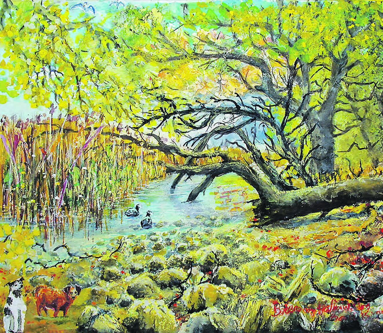 ro. Solche besonderen Landschaften gibt es am Hallwilersee. Bild beim Uferweg Böju-Mosen im Gebiet «Ort». Umgestürzte tote Bäume neben lebenden Bäumen, Tod und Leben nahe beieinander. Dann Bollensteine, angespült in die Uferzone Hallwilersee und durch einen Schilfgürtel abgegrenzt. Über allem ein weiter Himmel mit seinem Wolkenbild. Ein leuchtender Tag mit seinen kleinen Besonderheiten. In dieser Oase fühlen sich nicht nur beide Blässhühner wohl – so auch ein Schilfrohrsänger, ich selbst und unsere lieben Hundeli Uggo und Jessi. Beim ganzen Zusammenspiel dieser Landschaft mischt sich bei mir Musik mit ein – Ravels «Bolero». Angetan von einer Foto von David Zehnder habe ich mich an diese wunderbare Stimmung erinnert und diese Kleinlandschaft gemalt, so, wie ich sie von früher her kenne…