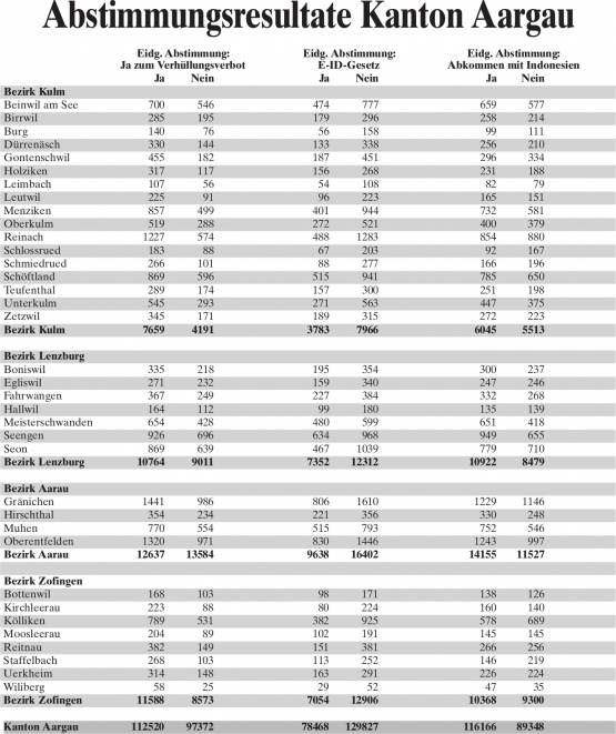 Ganz auf der Linie mit der Mehrheit des Schweizer Stimmvolks: Der Bezirk Kulm sagt Ja zum Verhüllungsverbot im öffentlichen Raum und zum Wirtschaftsabkommen mit Indonesien. Keine Chance hatte dagegen das Bundesgesetz über elektronische Identifizierungsdienste (E-ID-Gesetz).