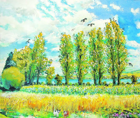 ro. Vom Bänkli unten an der Staadmattstrasse geht es nördlich weiter zum Müllerhüsli und in Gegenrichtung zur Badi Böju. Vom Gebiet Ägelmoos um dieses Bänkli geht unser Blick hinüber nach Meisterschwanden über bäuerliche Felder, Korn und Mais, und über Natur-Ufer und Hallwilersee. Für mich ist diese Landschaft harmonisch und in jeder Hinsicht ach wohltuend, womit ich die Bäume am Uferweg und auch die bäuerliche Nutzung der Baumann-Felder ehren möchte. Über allem wölbt sich ein typischer Seetalerhimmel mit seinen wechselnden, aber immer wunderbaren Wolkenbildern. Die Bussarde im Luftraum sind gwunderig und begrüssen uns aus ihrem herrlichen Flug – da können wir nur zuschauen und bewundern.