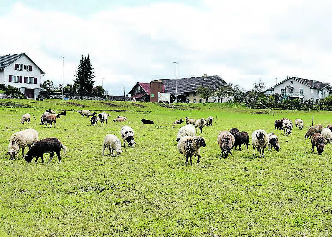 mars. Der Pfeffiker Gräbacher befindet sich momentan in einer sympathischen «Zwischennutzung». Eine Herde Schafe mäht auf der Wiese und sorgt mit ihrer Anwesenheit für etwas Idylle auf der Wiese, bevor sie den Baumaschinen wird Platz machen müssen. Grosse Informationstafeln kündigen dort die neuen Wohnbauten des Gräbacherparks an. Gebaut werden sollen vorerst zwei Mehrfamilienhäuser mit 18 Eigentumswohnungen mit 2.5 bis 5.5 Zimmer. (Bild: mars.)