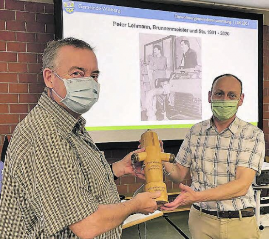 (Eing.) An der Gemeindeversammlung Wiliberg wurde der langjährige Brunnenmeister Peter Lehmann (l.) von Gemeindeammann Patric Jakob verabschiedet. Peter Lehmann sorgte während 30 Jahren für einwandfreies Trinkwasser in Wiliberg, Hintermoos und Teilen von Bottenwil und Staffelbach. Während seiner langjährigen Tätigkeit musste er sich auch in neue Techniken einarbeiten. Das Bild auf der Leinwand zeigt ihn (rechts) im Jahr 1992 im Reservoir Farnweid während den Instruktionen zur neu installierten Druckerhöhungspumpe. (Bild: zVg.)