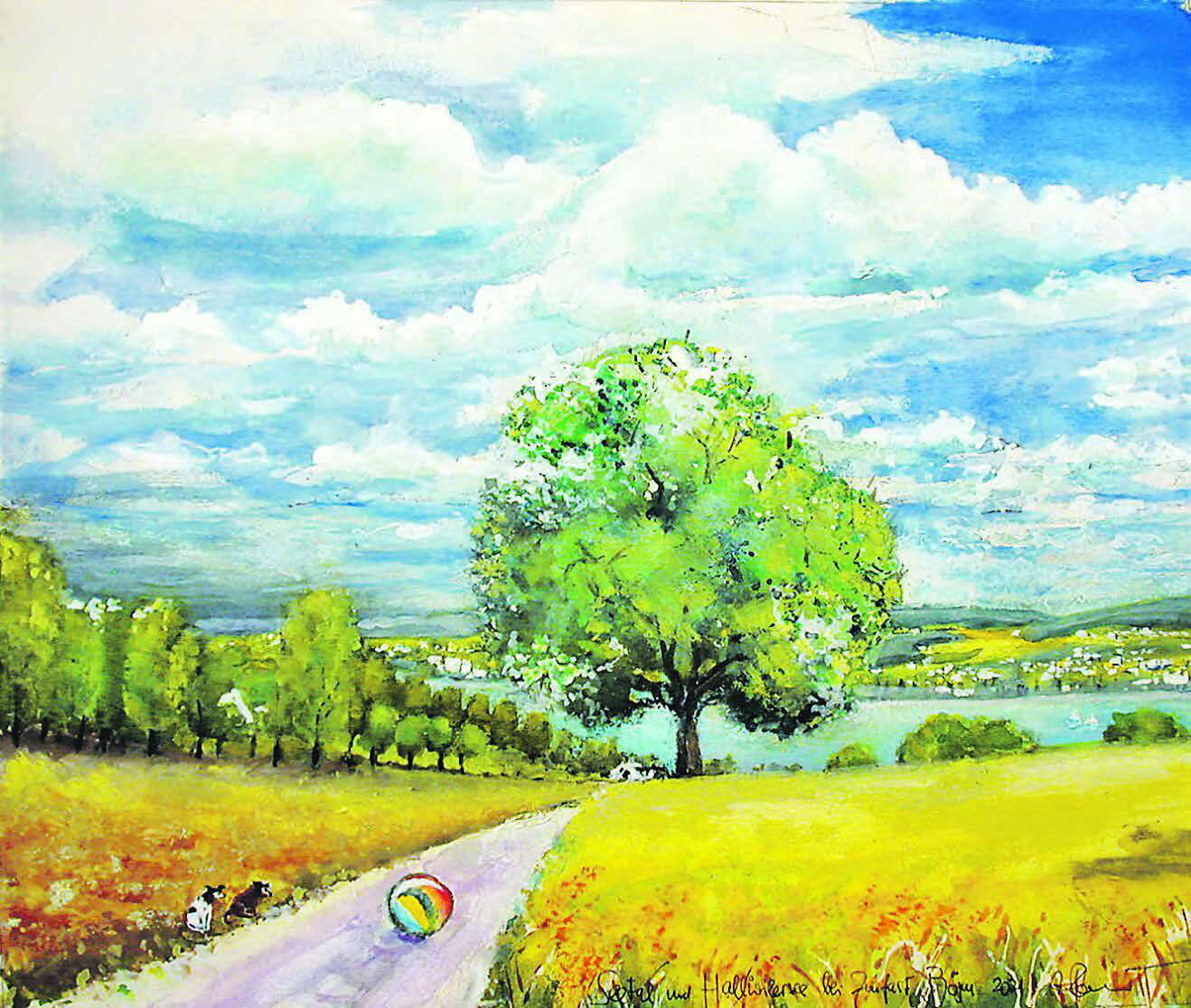 ro. Kaum aus dem Wald von Menziken, herkommend auf der Sandstrasse, werden wir richtiggehend begrüsst von einem freistehenden Birnbaum zwischen Gebiet Ammetschwang und Bruggmatt. Erscheint dieser Baum in der Mitte des Ausblicks, kann man einfach nur noch schauen und geniessen. Es öffnet sich das wunderschöne Seetal mit dem Hallwilersee unter einem herrlichen Spätsommerhimmel mit seinem Wolkenbild. Gegenüber Böju liegt das Dorf Meisterschwanden mit dem Lindenberg und weiter nördlich Tennwil. Das Dorf Böju ist noch versteckt hinter einer Baumgruppe. Für mich rollt eine Glücksmurmel symbolisch auf mein Dorf Böju zu. Auch die Hundeli Uggo und Jessi staunen darüber. Symbolisch für das Glück, hier am Hallwilersee in Böju daheim sein zu dürfen.