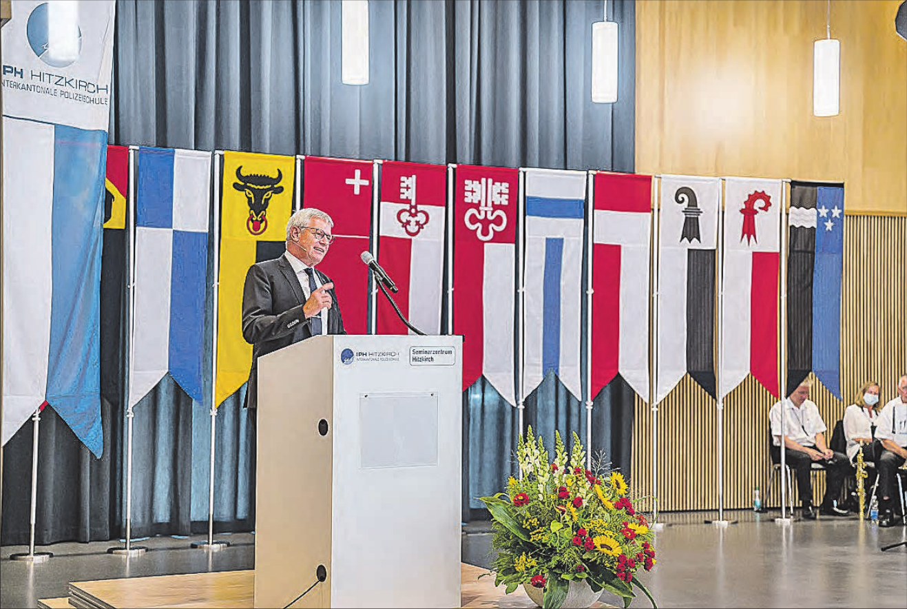 «Stopp, Polizei!», hallt es schrill um eine Hausecke im weitläufigen Trainingszentrum Aabach der Interkantonalen Polizeischule in Hitzkirch (IPH). Mit gestreckter Pistole nähern sich mehrere Polizeiaspiranten entschlossen einem vermeintlichen Verbrecher. Ihre Blicke und ihr Gang drücken den Ernst der Lage aus. Und doch gibt es Auffälliges zu beobachten. Die in Blau gehaltenen Uniformen variieren. «Polizei» oder «Police» ist auf den Schusswesten in unterschiedlichen Schriftzügen zu lesen.