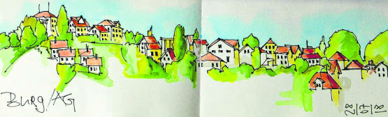 mars. Gestern Abend stimmten die Gemeindeversammlungen in Burg und Menziken über den Zusammenschluss der beiden Dörfer ab. Die Frage, ob es sich im Bild oben um die neue Menziker Skyline gegen Südwesten handelt, wurde allerdings erst nach Redaktionsschluss beantwortet. Mehr dazu in der nächsten Ausgabe. (Bild aus dem Skizzenbuch von Zeichner und Künstler Kari Stutz)