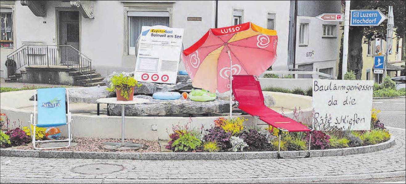 rc. Die Bautätigkeiten in der Seetaler Gemeinde gaben und geben ja immer wieder zu reden. Aktuell entsteht beim Strandbad am Hallwilersee jedoch kein 16-stöckiger Hotelkomplex und auch von einem Yachthafen will man bei der Bauverwaltung nichts wissen. Lediglich die Markise wird durch ein Lamellendach ersetzt, erweitert und der überdachte Teil mit einer Treppe verbunden. Warum man mit den Bauarbeiten im Strandbad bis zum Saisonstart zugewartet hat, steht in den Gemeindenachrichten: eine kantonale Zustimmung war erforderlich und diese liess offenbar auf sich warten. Soviel zu den Fakten. Was jetzt kommt, ist reine Spekulation: Um dem Baulärm auszuweichen, haben sich Unbekannte − man vermutet die Maibuben − zusammengetan, eine für Böju eher untypisch unkomplizierte Lösung gefunden und…
