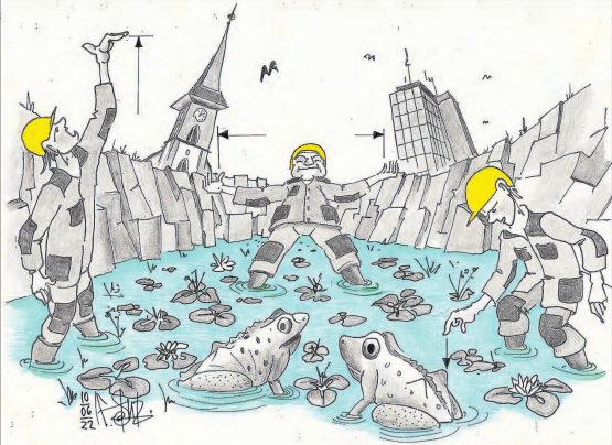 «Soo hööch wird de Neubau, soo gross ischs Loch und soo tüüf isch die Glungge». Wenn in ferner Zukunft aus der trüben «Waag-Glungge» längst ein schmuckes Biotop geworden ist, fragt man sich aus der Frosch-Perspektive besorgt, was daraus noch werden soll, wenn die Baumaschinen zurückkommen, um weiter zu machen?