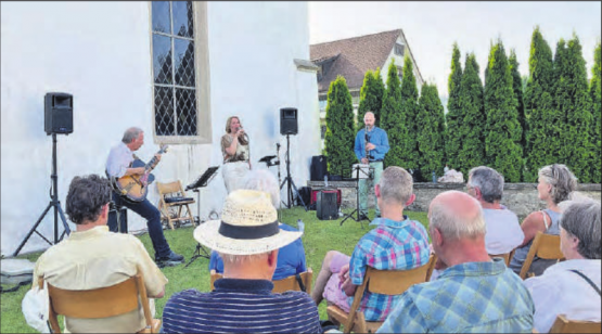 (Eing.) Wegen der Hitze fand das Konzert nicht unter dem Apfelbaum, sondern auf dem Rasen im Schatten der Kirche statt.Wunderschöne und berührende Jazzmelodien aus den 1930er- bis 1960er-Jahren gekonnt gesungen und gespielt von Stefanie Tornow (Gesang), Beat Baumli (Gitarre) und Simon Wyrsch (Bassklarinette) begleiteten in den Sommerabend. Die Zuhörenden gingen mit und genossen die Musik, den lauen Sommerwind und das besondere Ambiente. Gerne verweilte man anschliessend bei Apéro und angeregten Gesprächen im Schatten des Apfelbaumes. Wie es die Musiker sagten: Ein stimmiger Einstieg in einen chilligen Sommerabend. (Bild: zVg.)