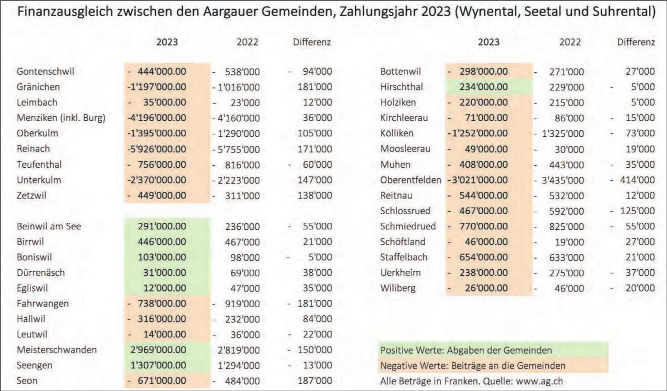 rc. Alle Gemeinden im Wynental und fast alle im Suhrental erhalten im kommenden Jahr wiederum Beiträge ausbezahlt. Nur Hirschthal gehört zu den Gebergemeinden, daran hat sich nichts geändert. Insgesamt fliessen auf diese Weise 16’768’000 Franken ins Wynental, das sind 636’000 Franken oder 3,9 Prozent mehr als in diesem Jahr. Im Suhrental sinkt der Gesamtbetrag dagegen um fast den gleichen Wert: von 8’498’000 Franken auf 7’830’000 Franken. Erstmals seit Einführung der heute geltenden Rechtsgrundlagen im Jahr 2018 ist das Gesamtvolumen…