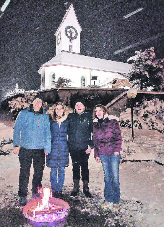 (Eing.) In der bis dahin kältesten Nacht des Jahres trafen sich Mitte Dezember 60 Gäste zu einem gemütlichen Abend rund um die Lüpuer Pfarrgarage. Kinder grillierten Marshmallows über dem Adventsfeuer, ukrainische Jugendliche schossen Selfies mit der hell erleuchteten Kirche im Hintergrund, Erwachsene genossen Gemüsesuppe, Speckzopf und Punsch in der weihnächtlich geschmückten Garage. Um die kalten Füsse aufzuwärmen, stand im beheizten Pavillon eine Kaffeestube mit Weihnachtsgebäck bereit. Beim Verabschieden kommentierte eine Besucherin den Anlass mit den Worten: «Hoffentlich wird der Adventstreff nächstes Jahr auch wieder stattfinden!» Im Bild: René Aeschimann, das Pfarrehepaar Christina und Michael Freiburghaus sowie Fränzi Müller bildeten das Kernteam des Adventstreffs 2022. (Bild:…