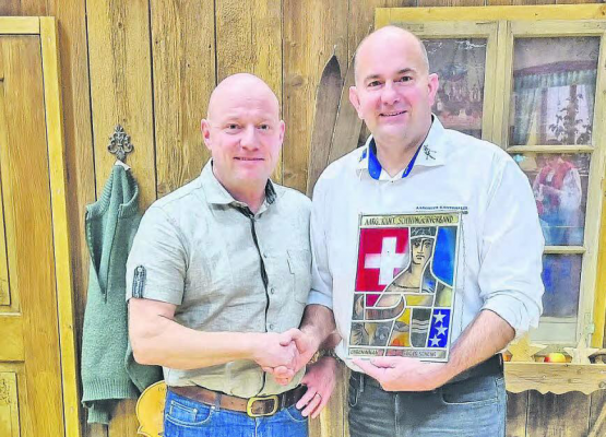 jg. Der 41-fache, ehemalige Kranzschwinger und dreifache Schwingfestsieger Roger Schenk aus Kirchleerau ist eines der sieben neuen Ehrenmitglieder, die anlässlich der 116. Delegiertenversammlung des Aargauer Schwingerverbands in Möhlin in die Garde der Ehrenmitglieder aufgenommen wurde. Roger Schenk war nach seiner Aktivzeit Jungschwingerobmann und später Vizepräsident beim SK Zofingen. Im Kantonalverband amtete er ebenfalls als Jungschwingerobmann und später als Technischer Leiter. Nebst Roger Schenk wurden auch Rolf Treier, Pascale Alpiger, Milena Meyer, Ernst Meier, Astrid Rohner-Vogt und Thomas Notter zu neuen Ehrenmitgliedern ernannt. Im Bild: Stolz gratuliert Martin Anderegg, Präsident des Schwingklubs Zofingen (links), seinem ehemaligen Vizepräsidenten Roger Schenk zu dieser…