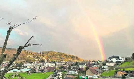 Ein prächtiges Farbenspiel entstand nach abendlichen Regenschauern über dem Wynental, als sich die Sonne wieder zeigte. Nur wenn die Sonne im Rücken steht, ist der Regenbogen sichtbar. Das liegt daran, dass jeder Lichtstrahl der Sonne auf eine andere Stelle des runden Regentropfens fällt. Das Licht wird vom Regentropfen gebündelt und mit einem Winkel von rund 42° zurück geworfen. Und nur wenn man in diesem Winkel zur Regenfront steht, können die bunten Lichtstrahlen das Auge erreichen.