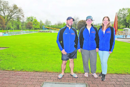 rc. «Das wird schon noch», war die Grundaussage des Betriebsleiters Quirin Bohni, als das Blättli am Montagmorgen einen Augenschein in der Badi Rütimatten in Schöftland vornahm. Grund für das Fernbleiben der Badigäste dürfte dabei nicht der gleichzeitig stattfindende Schöftler Märt gewesen sein, als vielmehr das garstige Wetter. Zwar meldete die Anzeigetafel neben den Schwimmbecken angenehme 24 Grad Wassertemperatur, die 14 Grad Luftemperatur sprachen Anfang Woche aber noch eher gegen einen Badi-Besuch. «Am Morgen hat es in Strömen geregnet», ergänzte der Betriebsleiter, «aber das wiederum hat die Gäste nicht abgeschreckt.» Tatsächlich habe eine Handvoll Personen um 9 Uhr morgens sogar eine Schlange gebildet vor dem Eingang. Quirin Bohni, Francine Jaquet und Sandra Morgenthaler (v.l.)…